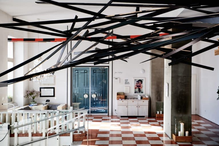 Lackierte, teils zersplitterte Holzlatten, die sich durch die gesamte Decke der Hotellobby ziehen – „Jigsaw falling into place“ konfrontiert Betrachtende zweifellos mit Ungewohntem. Mit Aufbruch und Veränderung. Dass die komplexe Deckeninstallation des steirischen Künstlers Clemens Hollerer aber eine spannende Symbiose mit den Wiesler-Jugendstilwänden eingeht, verdeutlicht sich bei genauerer Betrachtung: Wie ein Puzzlestein fügt sich das Kunstwerk in die Geschichte eines Hotels ein, das sich zeit seines Bestehens offen für kreative Einflüsse zeigt.