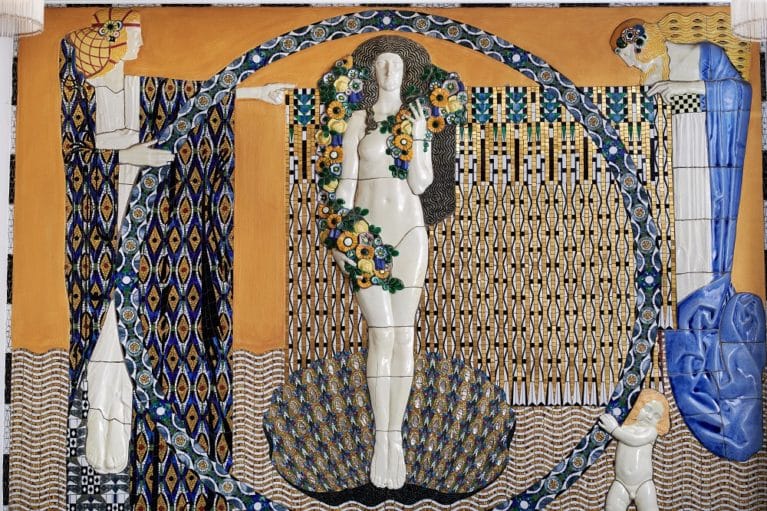 Die zeitgenössische Deckeninstallation Hollerers führt auch direkt in einen weiteren spektakulären Raum des Grand Hôtel Wiesler. Hier lässt das über 110 Jahre alte, original Jugendstil-Mosaik „Frühling“ von Leopold Forstner den gleichnamigen Veranstaltungsraum erstrahlen. Forstner, ein Schüler Koloman Mosers und Freund Gustav Klimts, war Mitglied der Wiener Secession und berühmt für seine Mosaiktechnik, deren Schönheit für die Ewigkeit zu bewahren, unsere Aufgabe bleibt.